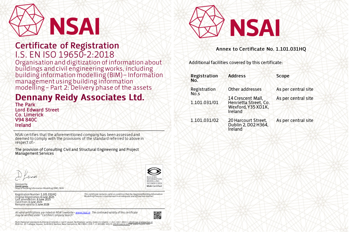 We are delighted to announce that we have achieved a significant milestone in obtaining NSAI Certification for IS EN 19650:2 2018 – Organization and digitization of information about buildings and civil engineering works, including building information modelling (BIM) — Information management using building information modelling Part 2: Delivery phase of the assets.